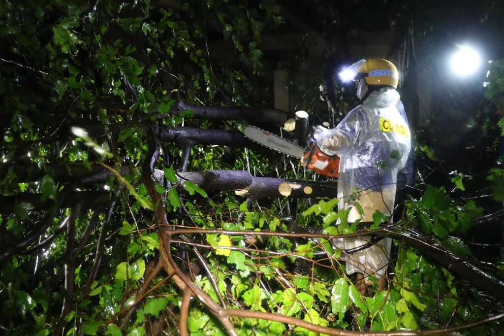 | Ngay trong đêm, lực lượng CSGT phối hợp với các lực lượng cắt cây bị đổ giúp người dân đi lại an toàn |